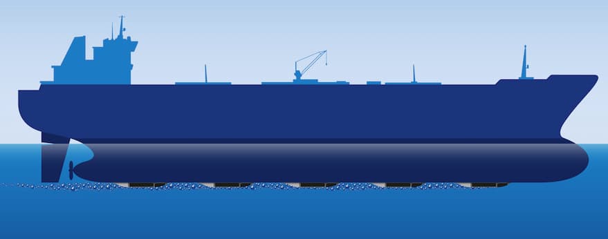 Cette couche d’air uniforme est générée par des oscillateurs fluidiques à travers le faisceau du navire, qui émettent 240 000 microbulles par seconde et par mètre.