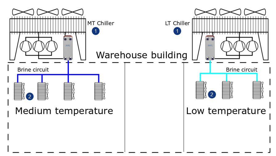 The schematic below shows an indirect system used in refrigeration where two chillers with medium and low temperatures respectively have their own setting points. Brazed plate heat exchangers would then work well as evaporators, due to their robustness, smaller space footprint and higher thermal efficiency. The chiller will then produce the cold brine and pump it to the cabinets, cold room and freezers.