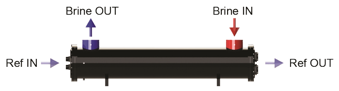 The Alfa Laval DM dry-expansion evaporator uses the well-known shell-and-tube heat exchanger principle to achieve the desired effect. The primary fluid, or refrigerant, flows through the tubes, while the secondary fluid (normally water or anti-freeze brine) flows over the tubes (through the shell) in order to bring about heat transfer from one fluid to the other.